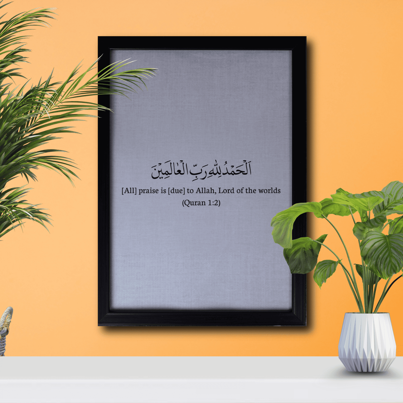This elegant wall frame showcases the sacred Quranic verse "Alhamdulillahi Rabbil ‘Alamin" — [All] praise is [due] to Allah, Lord of the worlds (Quran 1:2). Set against a soft grey background with minimalist aesthetics, it's a graceful piece to bring daily reflection and peace into your surroundings.