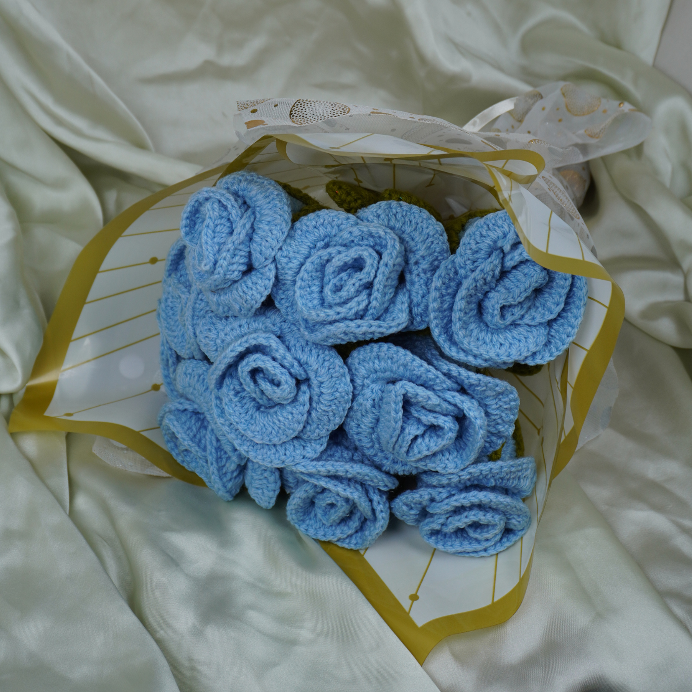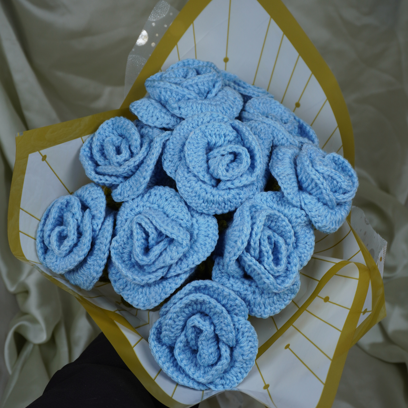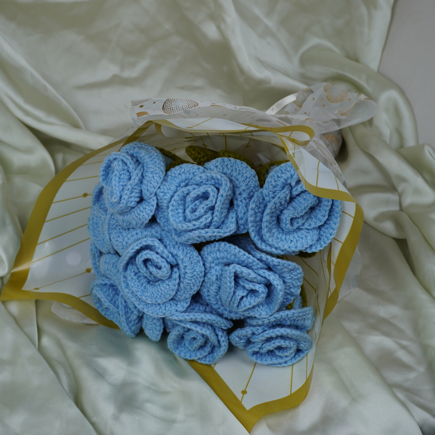 Inspired by handcrafted elegance, this crochet rose combo brings a bold blend of calming sky blue colors to any celebration. Each set features a lush cluster of roses carefully crafted with soft yarn, bundled in a striking black artisanal wrap. It adds a touch of artisanal charm to major milestones like anniversaries or weddings where a grander gesture is needed.