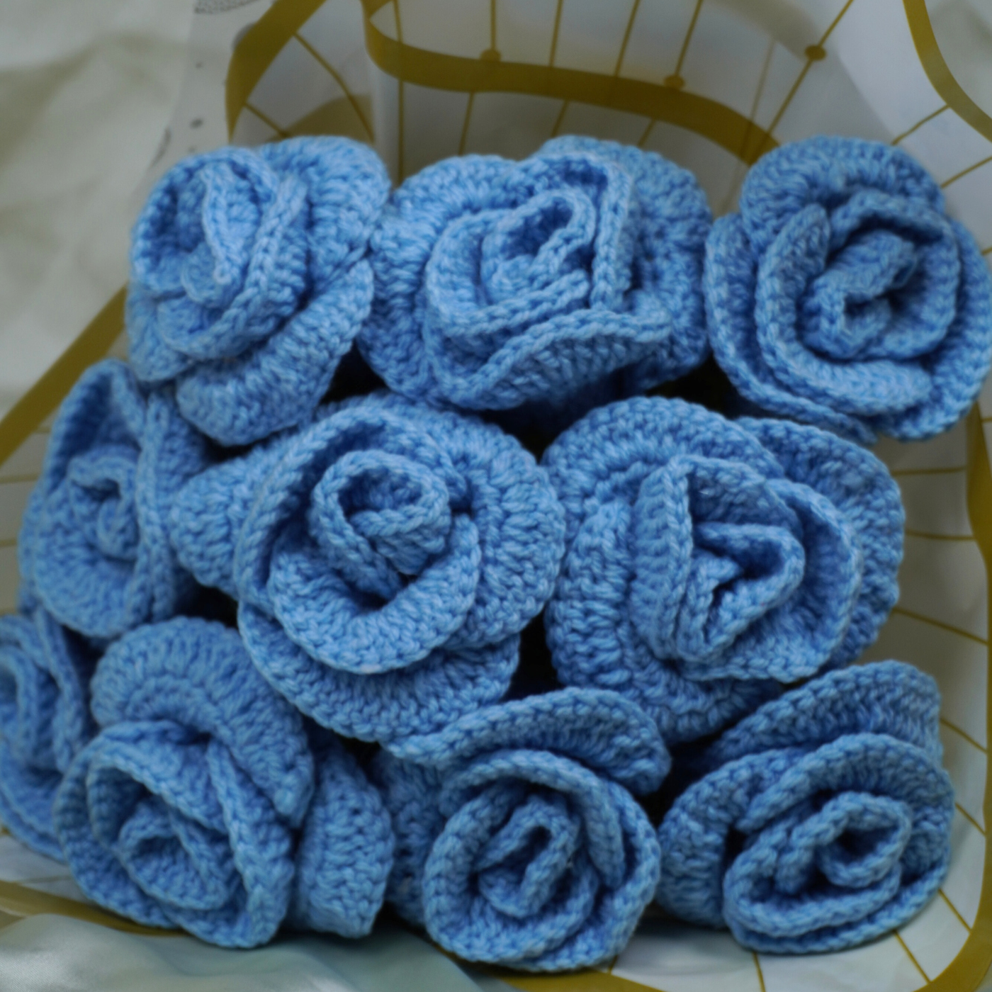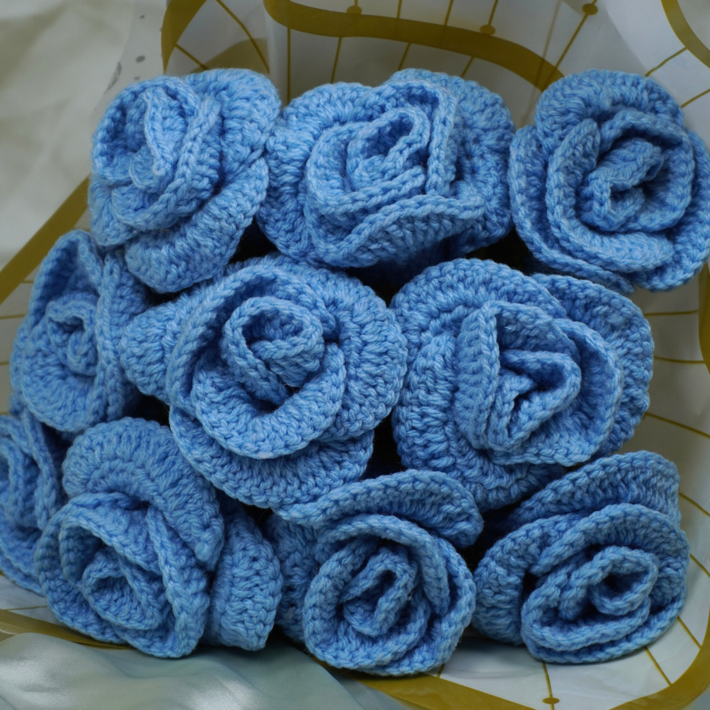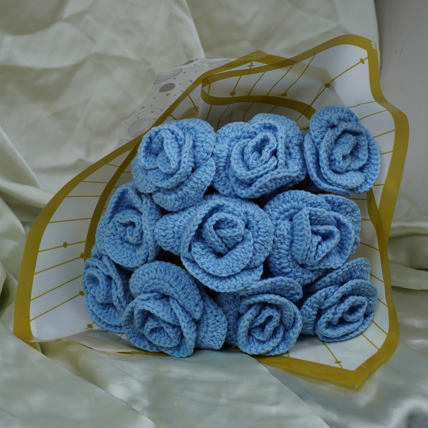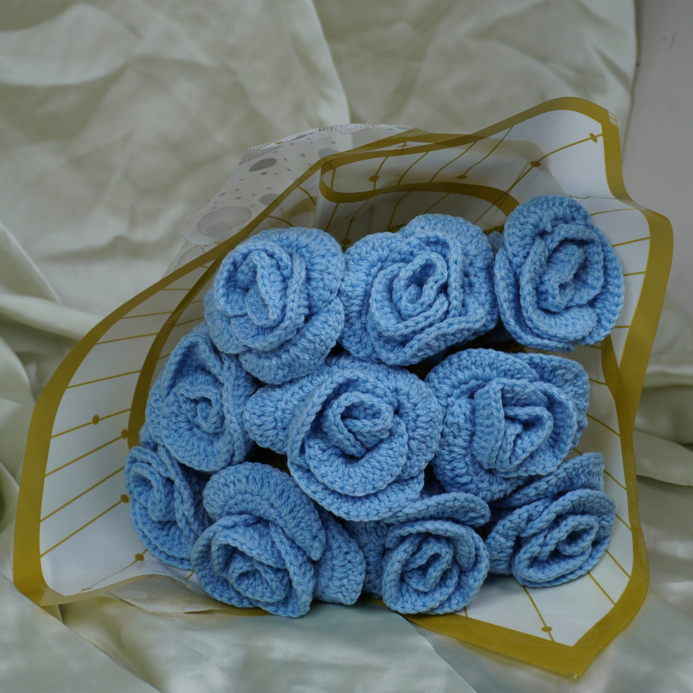 Inspired by handcrafted elegance, this crochet rose combo brings a bold blend of calming sky blue colors to any celebration. Each set features a lush cluster of roses carefully crafted with soft yarn, bundled in a striking black artisanal wrap. It adds a touch of artisanal charm to major milestones like anniversaries or weddings where a grander gesture is needed.