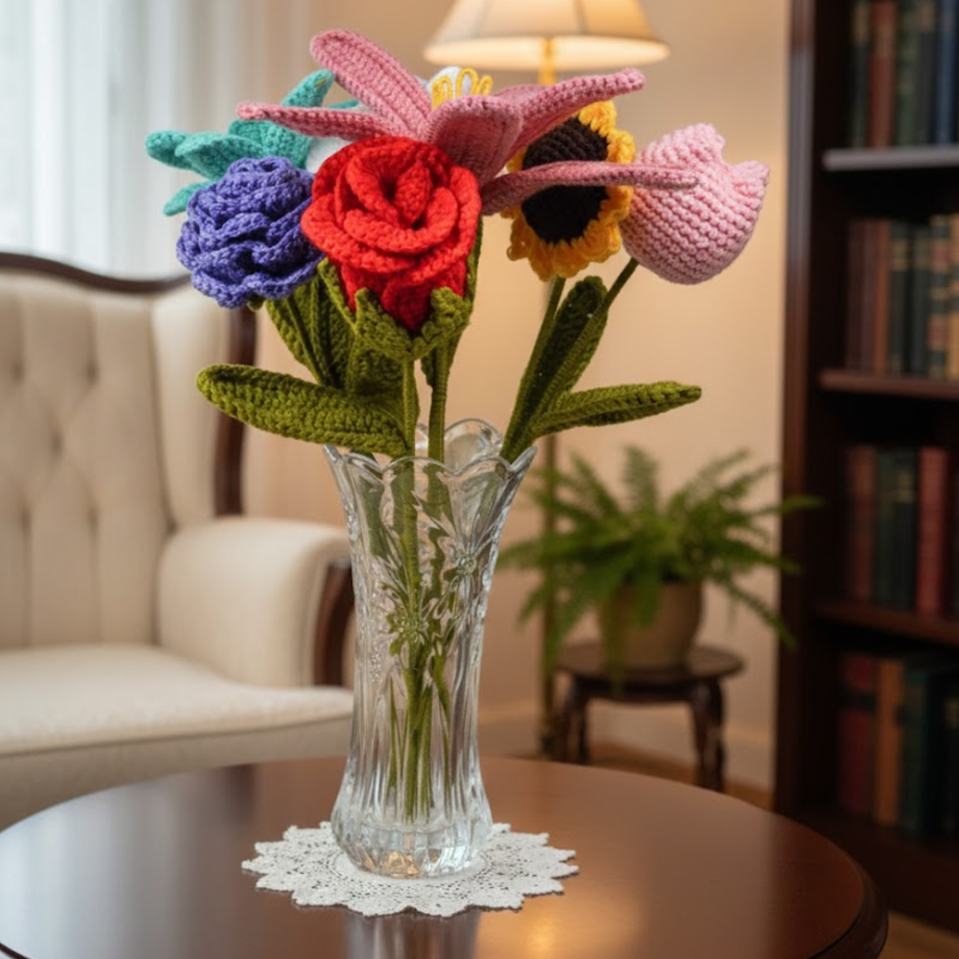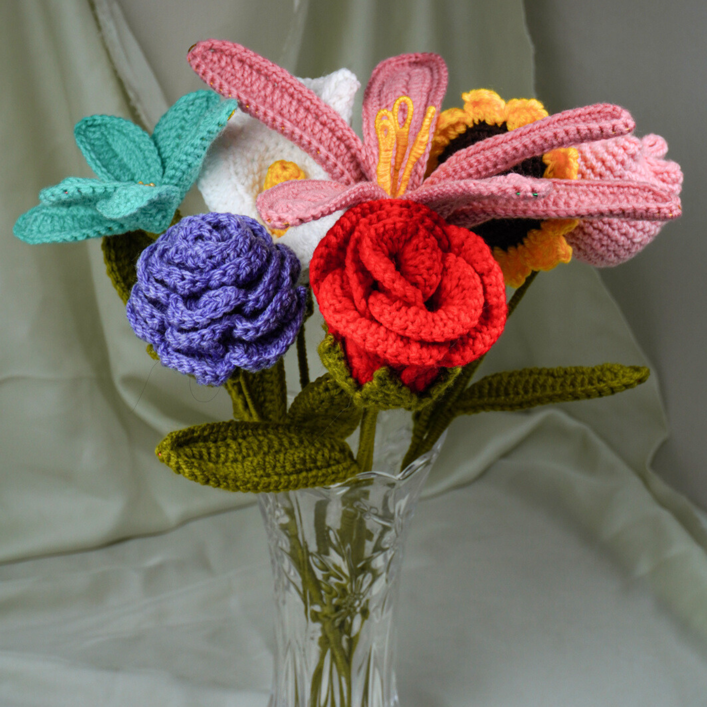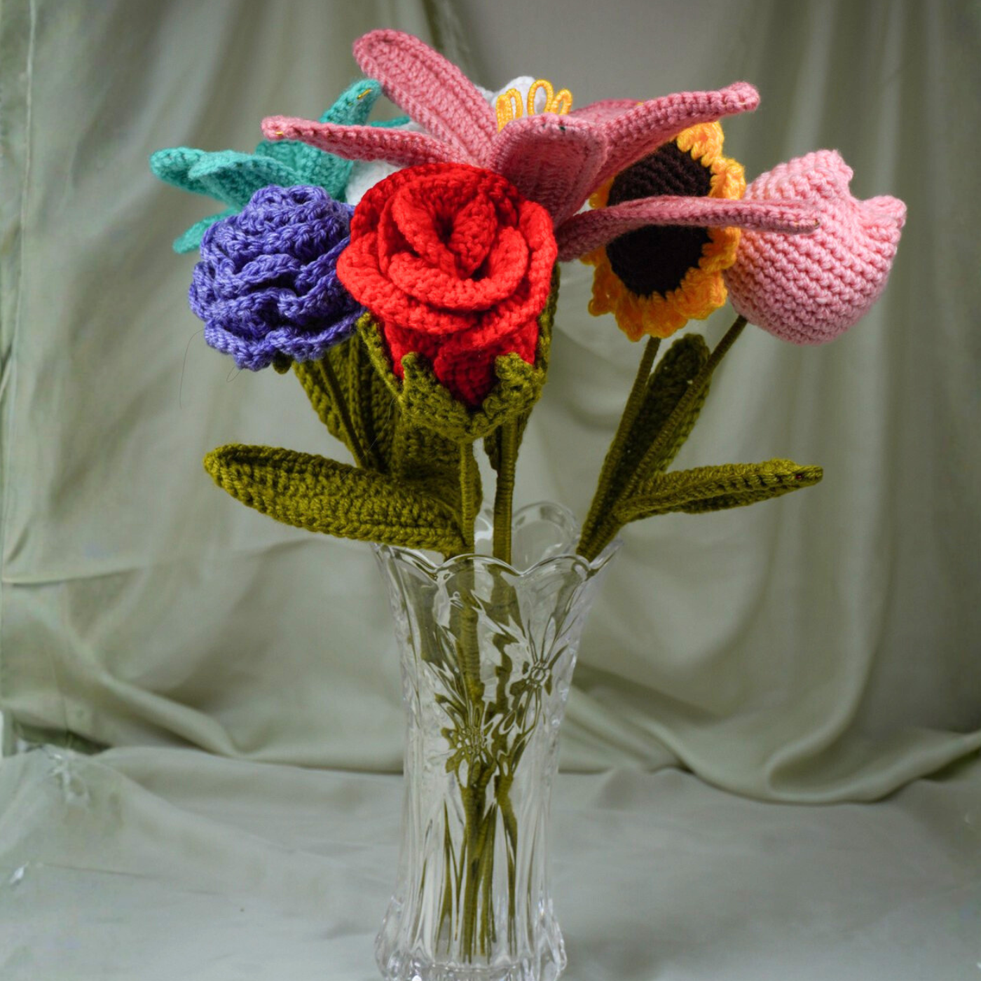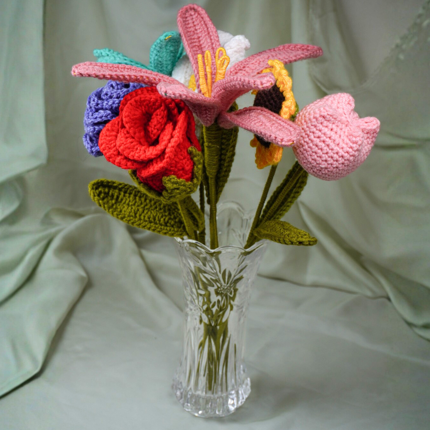 Inspired by handcrafted elegance, this crochet mixed bouquet brings a passionate blend of romantic red, royal purple, and sunny yellow colors to any celebration. Each flower—from the velvety rose to the radiant sunflower—is carefully crafted with soft yarn, creating a diverse and vibrant symbol of affection. Wrapped in rustic brown kraft paper with a matching twine bow, it adds a touch of artisanal charm to birthdays, graduations, or "just because" moments.