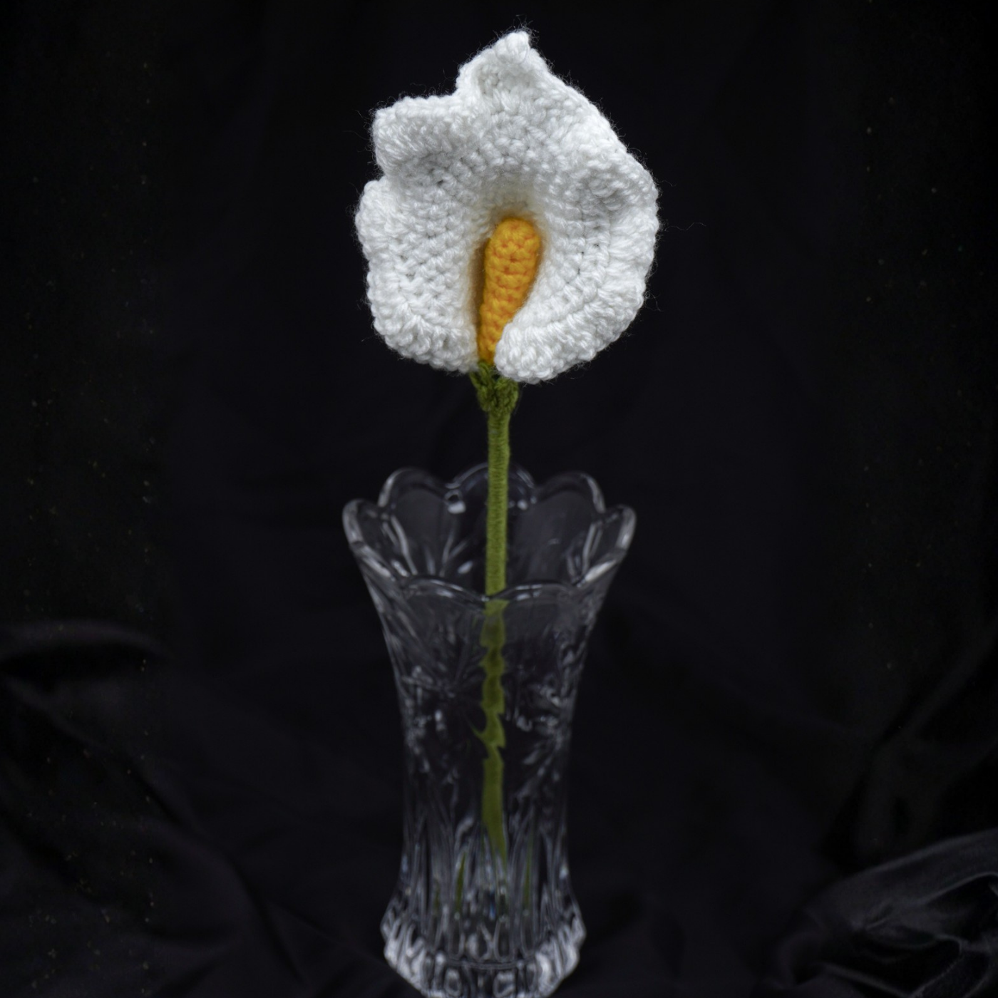 Inspired by handcrafted elegance, this single stem crochet calla lily brings a charming blend of white and yellow colors and texture to any space. This individual flower is carefully crafted with soft yarn, creating a playful yet refined decorative piece that stands out without overwhelming. Designed as a standalone single product, it adds a touch of artistry to vases or table settings.