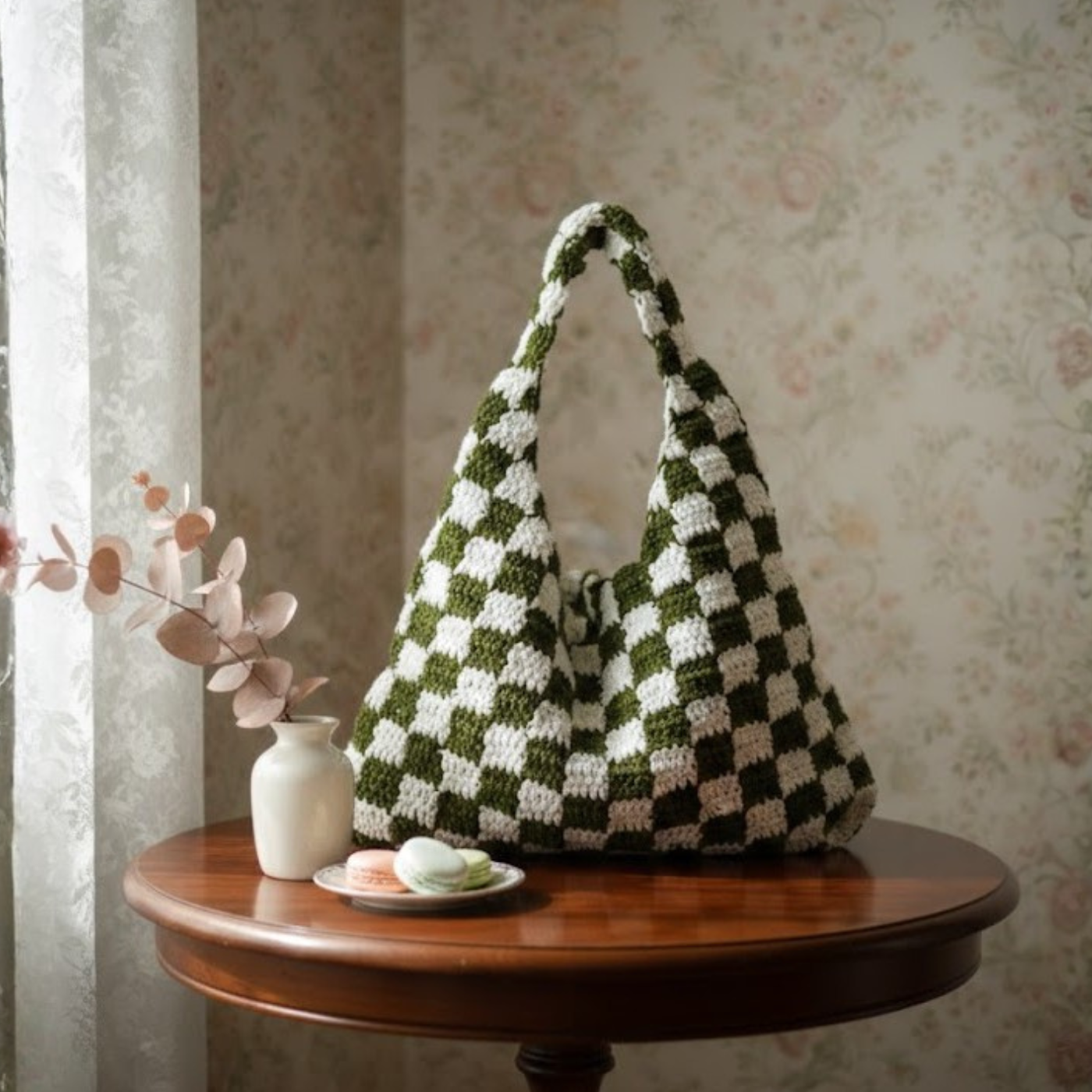 Inspired by handcrafted elegance, this crochet shoulder bag brings a charming blend of forest green and white colors and texture to any look. Each bag is carefully crafted with soft yarn in a classic checkered pattern, creating a playful yet refined accessory that stands out without overwhelming. Designed for a comfortable fit over the shoulder, it adds a touch of artistry to both casual and dressed-up styles.