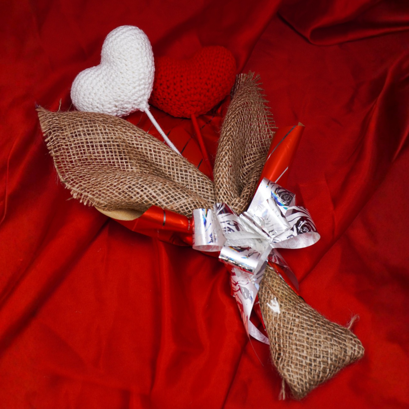Inspired by handcrafted elegance, this crochet heart bouquet brings a charming blend of romantic red and white colors and texture to any special occasion. Each heart stem is carefully crafted with soft yarn, creating a playful yet refined symbol of love that stands out without overwhelming. Designed as a complete arrangement wrapped in rustic burlap, it adds a touch of artistry and sentiment to Valentine's Day, anniversaries, or gestures of affection.