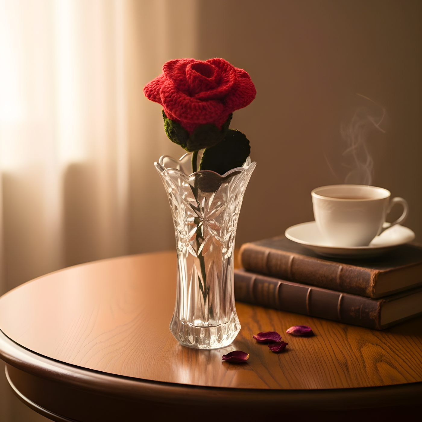 Inspired by handcrafted elegance, this single stem crochet rose brings a charming blend of deep red colors and texture to any space. This individual flower is carefully crafted with soft yarn to mimic a blooming rose, creating a playful yet refined decorative piece that stands out without overwhelming. Designed as a standalone single product, it adds a touch of artistry to vases or table settings.