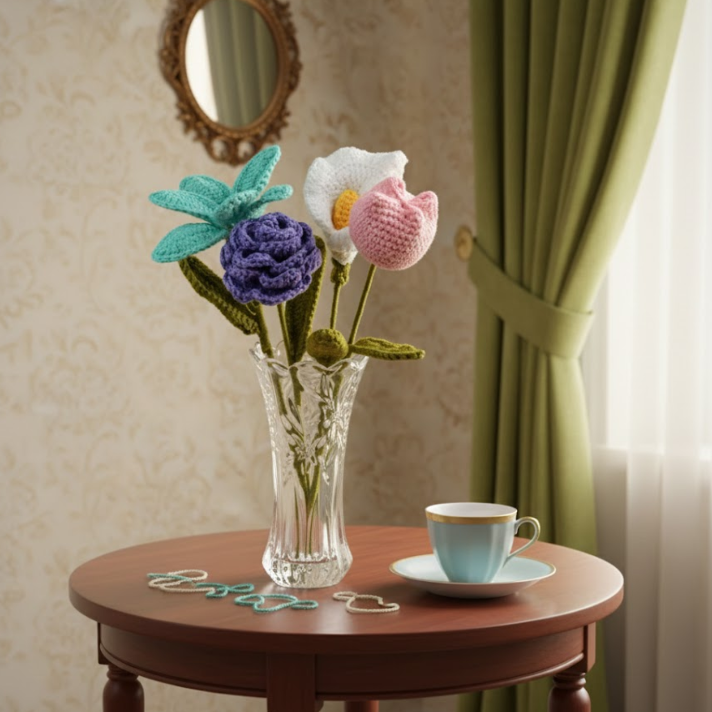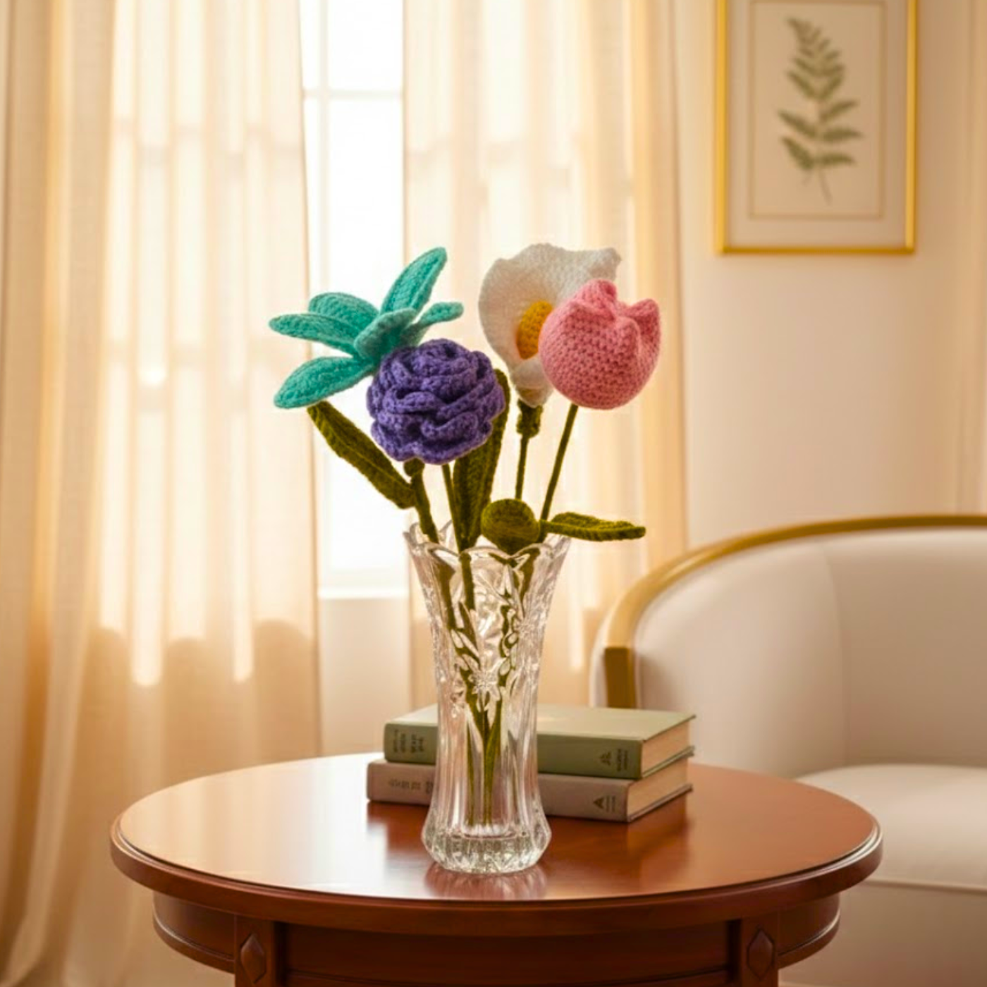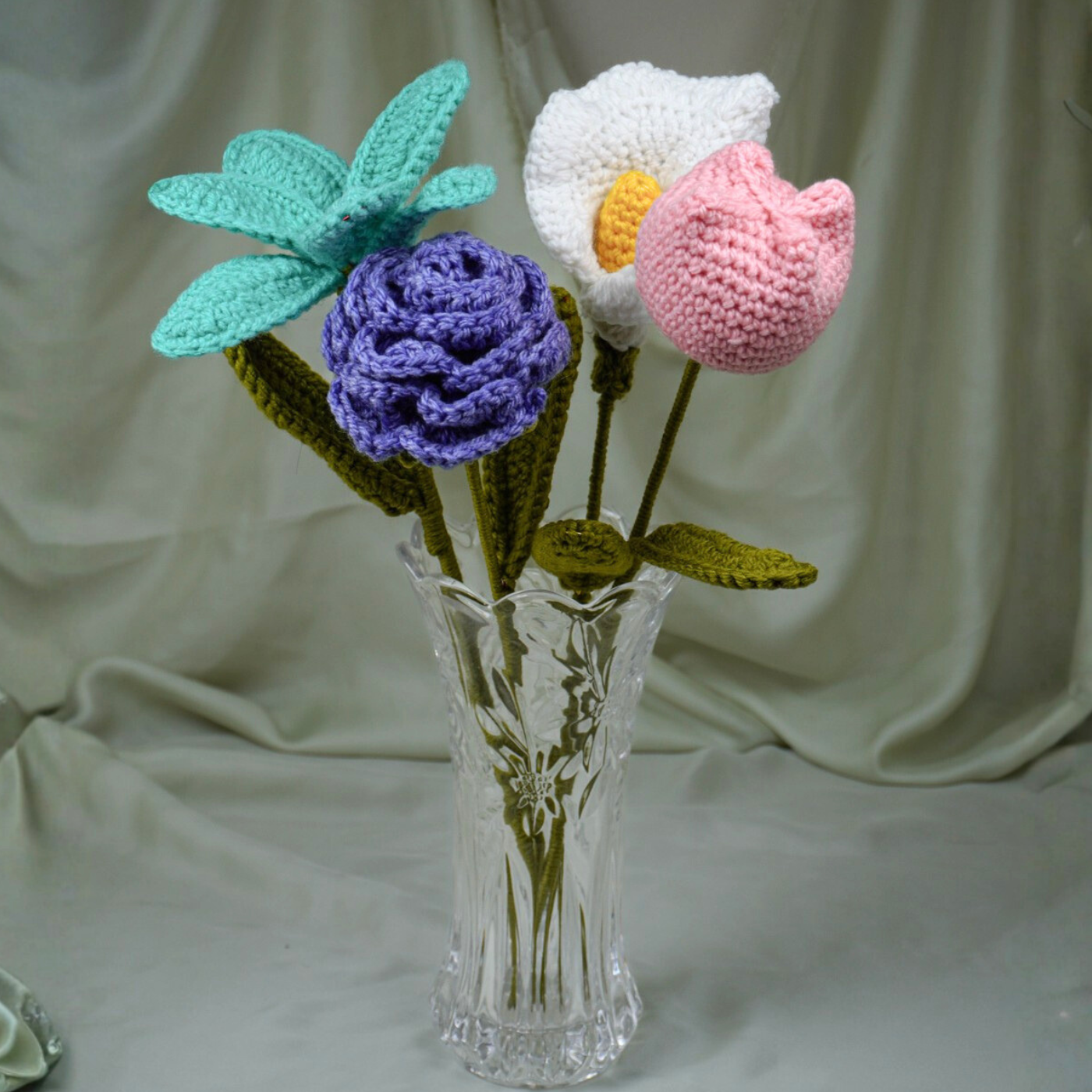 Inspired by handcrafted elegance, this crochet mixed bouquet brings a passionate blend of romantic red, royal purple, and sunny yellow colors to any celebration. Each flower—from the velvety rose to the radiant sunflower—is carefully crafted with soft yarn, creating a diverse and vibrant symbol of affection. Wrapped in rustic brown kraft paper with a matching twine bow, it adds a touch of artisanal charm to birthdays, graduations, or "just because" moments.