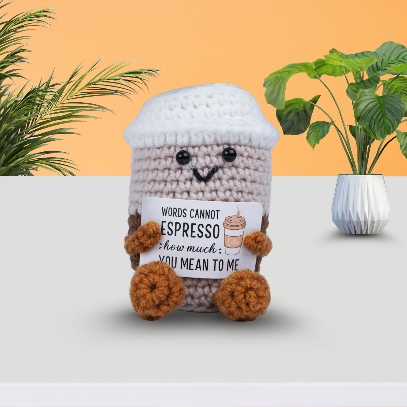 This handmade crochet espresso cup features a warm brown base with a fluffy white foam top and a cheerful face. It holds a mini sign that reads: “Words cannot espresso how much you mean to me.” Perfect for coffee lovers, it’s a daily reminder that affection can be as comforting as a fresh cup of coffee.