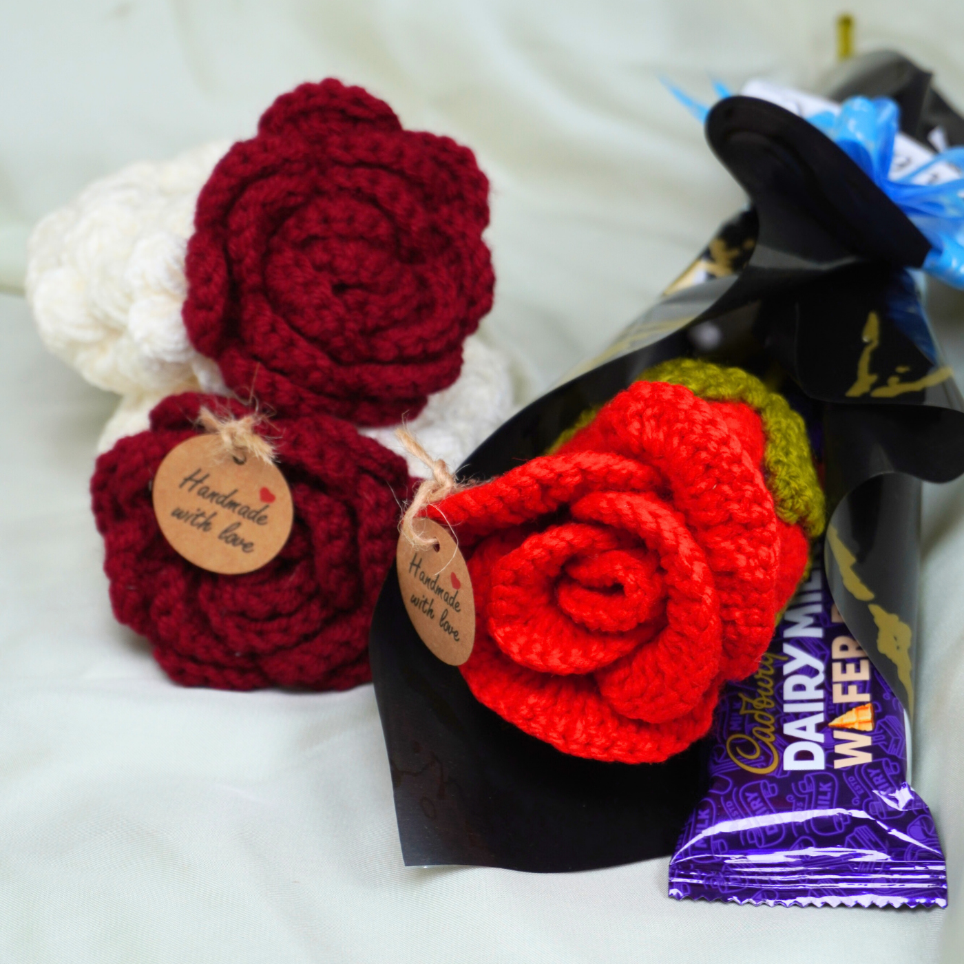 Unit: 1 Gift Bundle (1 Crochet Rose, 2 Gajras, 1 Chocolate Bar).