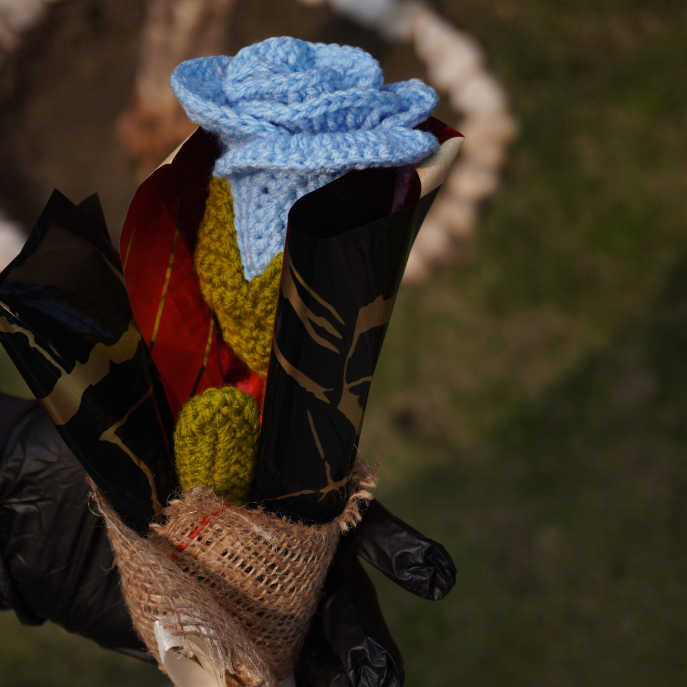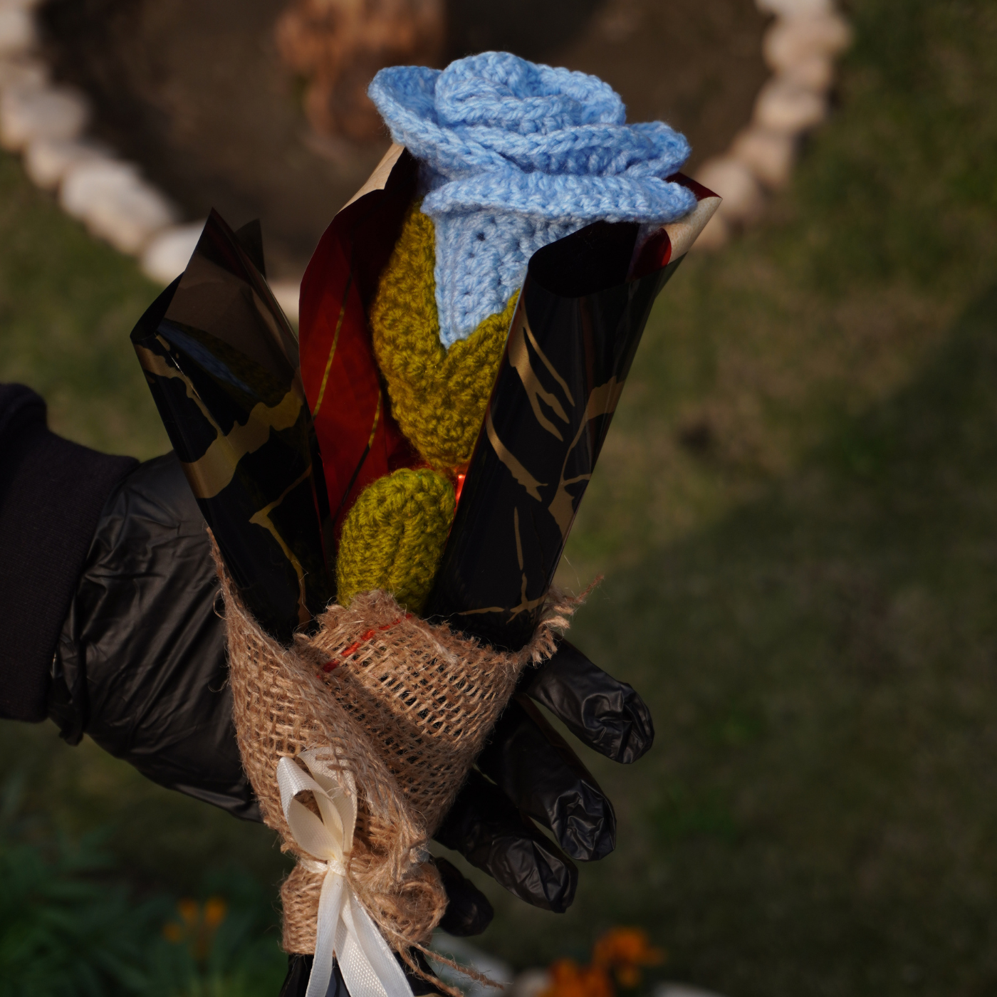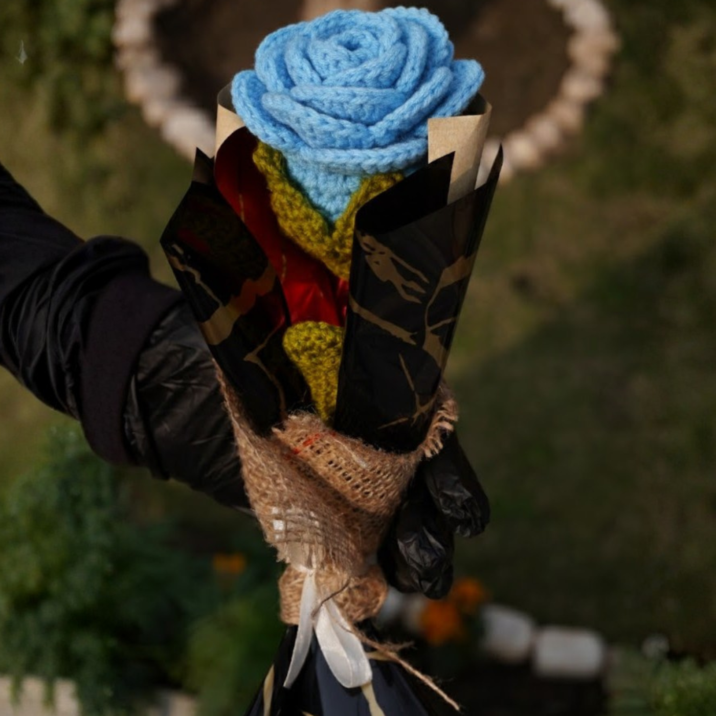 Inspired by handcrafted elegance, this crochet single-stem gift brings a passionate touch of romantic red or serene sky blue to any celebration. Each rose is carefully crafted with soft yarn and presented in a sophisticated midnight-black wrap with rustic burlap accents. Tied with a delicate white ribbon, it adds a touch of artisanal charm to birthdays, graduations, or as a thoughtful "thank you" gesture.