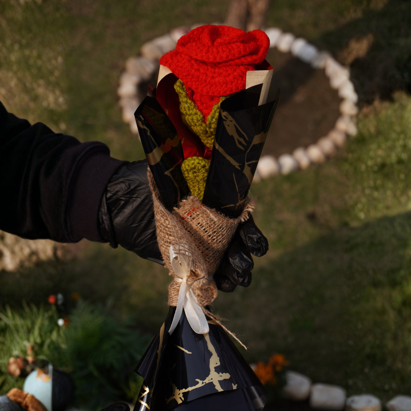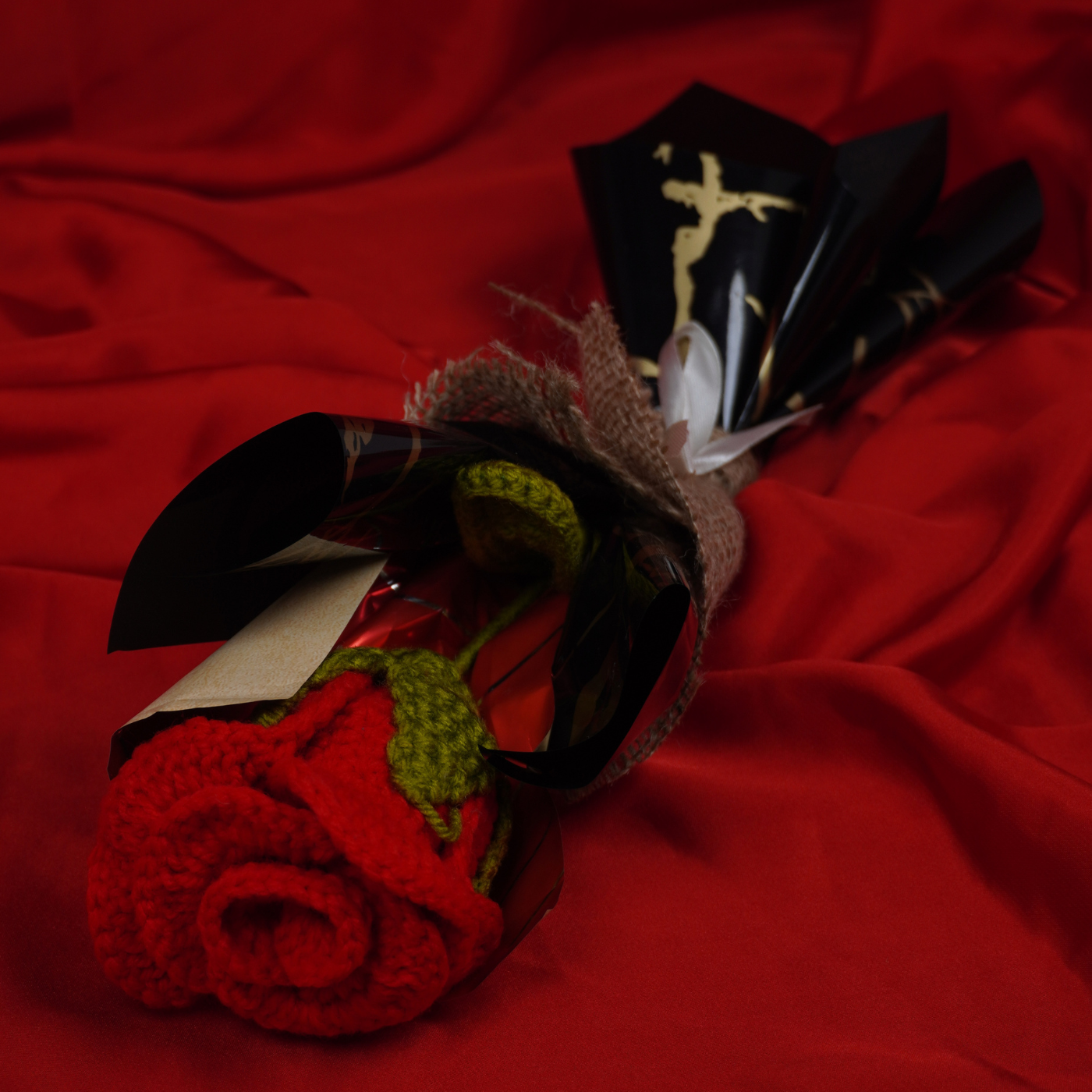 Inspired by handcrafted elegance, this crochet single-stem gift brings a passionate touch of romantic red or serene sky blue to any celebration. Each rose is carefully crafted with soft yarn and presented in a sophisticated midnight-black wrap with rustic burlap accents. Tied with a delicate white ribbon, it adds a touch of artisanal charm to birthdays, graduations, or as a thoughtful "thank you" gesture.