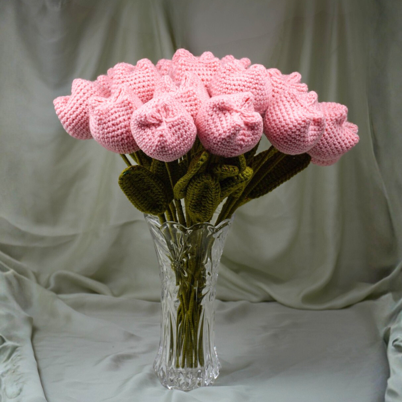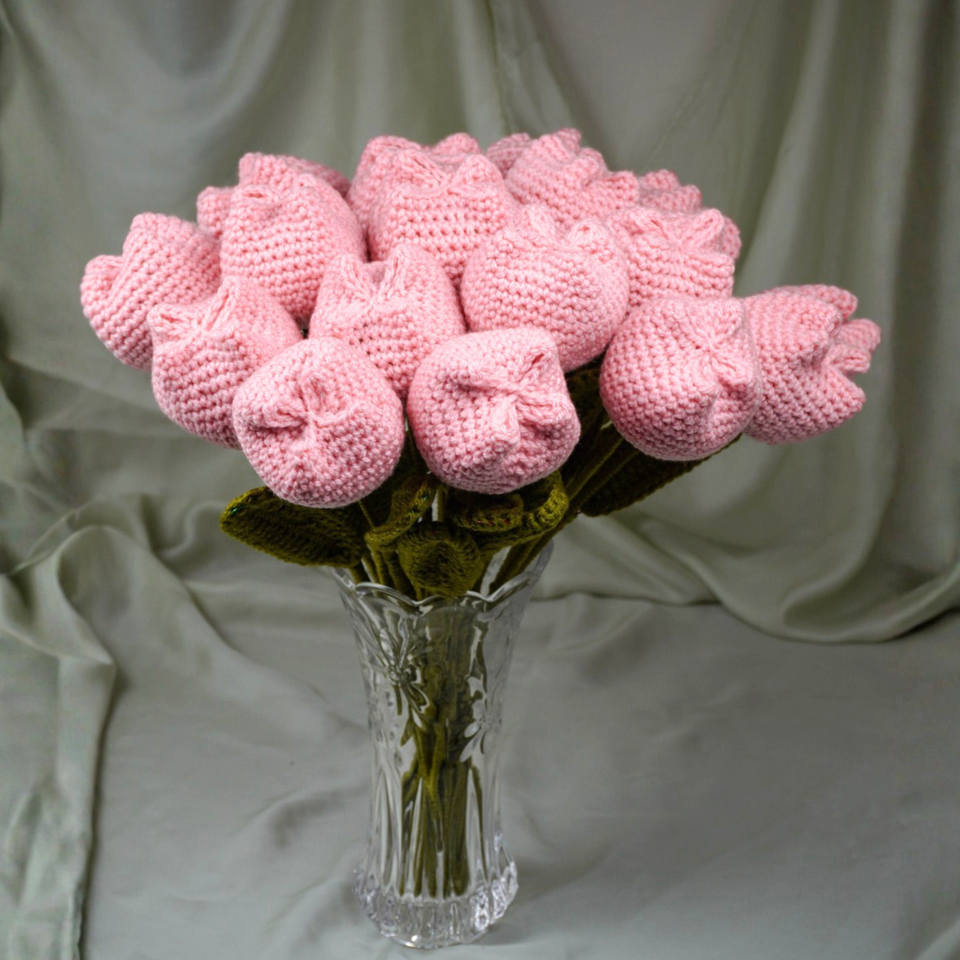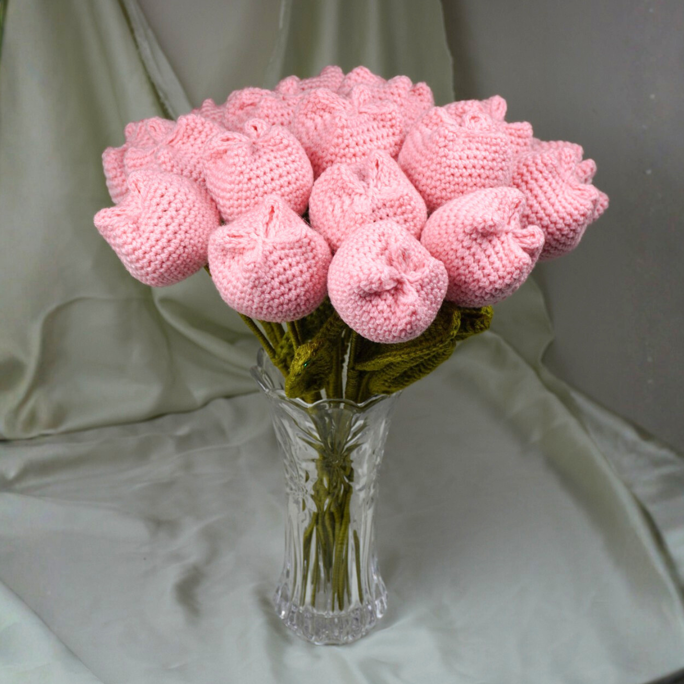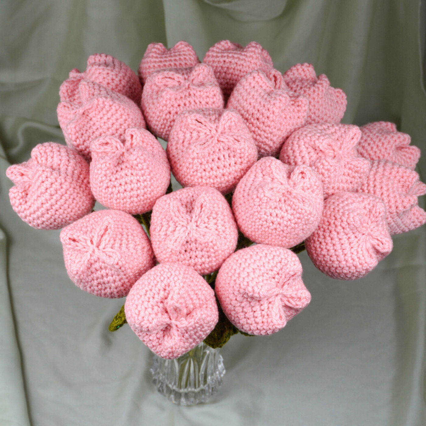 Soft pink handcrafted "puffed" crochet tulips