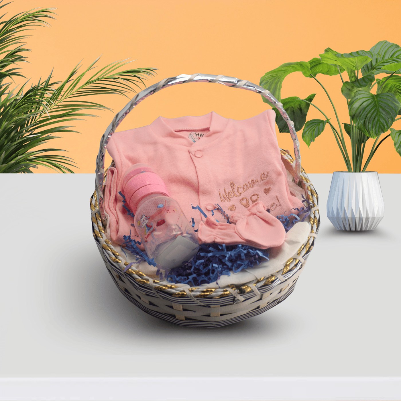 Start her journey in cozy style with this beautifully arranged pink-themed gift basket. It includes newborn essentials like a soft romper, bib, mittens, socks, and a BPA-free feeding bottle—everything thoughtfully wrapped in an elegant basket filled with decorative padding. Perfect for hospital welcomes, first-week photos, or as a heartwarming baby shower surprise. It’s a thoughtfully assembled bundle designed to celebrate your little one’s arrival in the sweetest way.