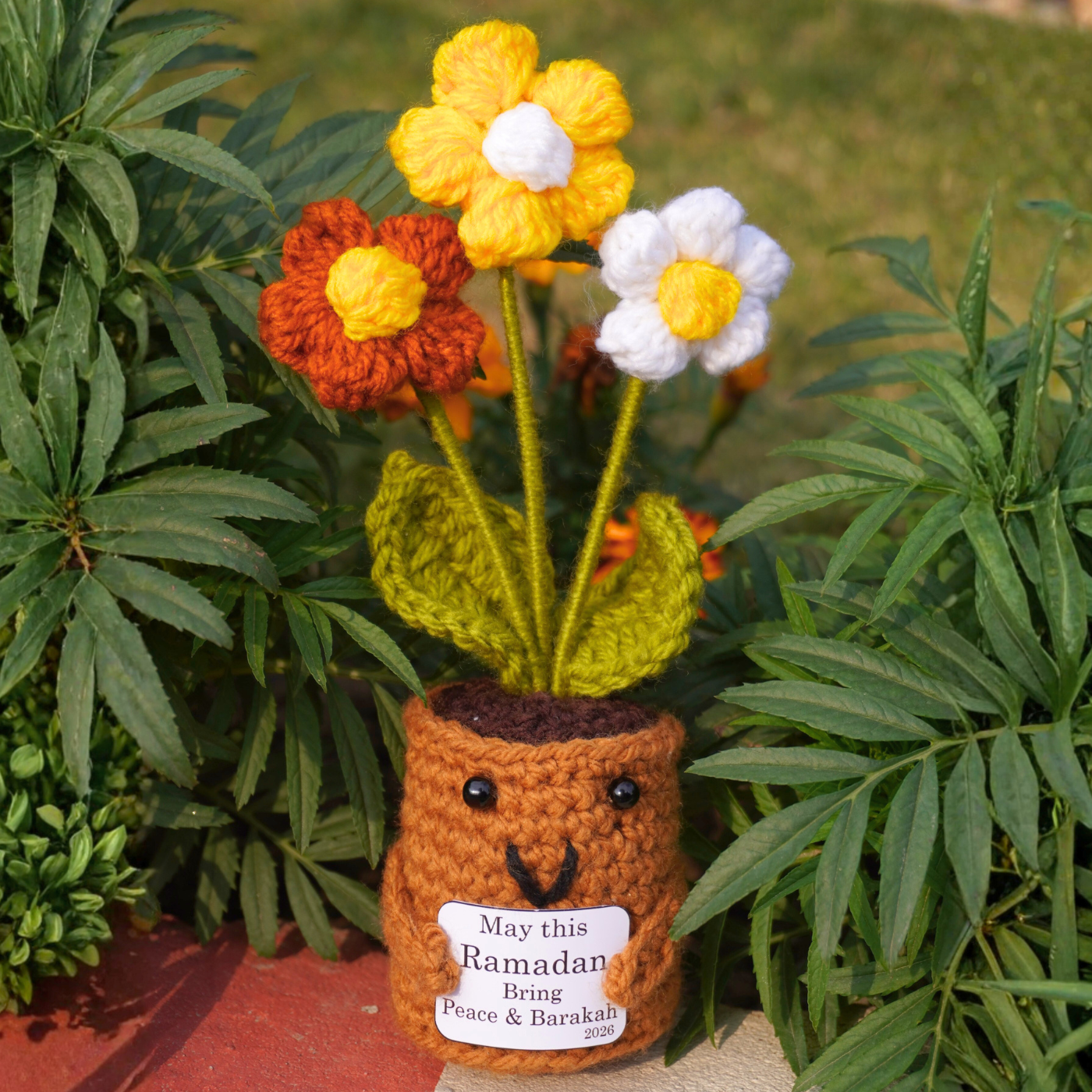 The concept of spiritual growth and flourishing, this set features three vibrant flowers emerging from a happy, smiling pot. With blooms in Autumn Rust, Sunbeam Yellow, and Cloud White, this piece serves as a symbolic reminder of the peace and blessings of the month. The base is an adorable character pot holding a prayer for "Peace & Barakah" in 2026.