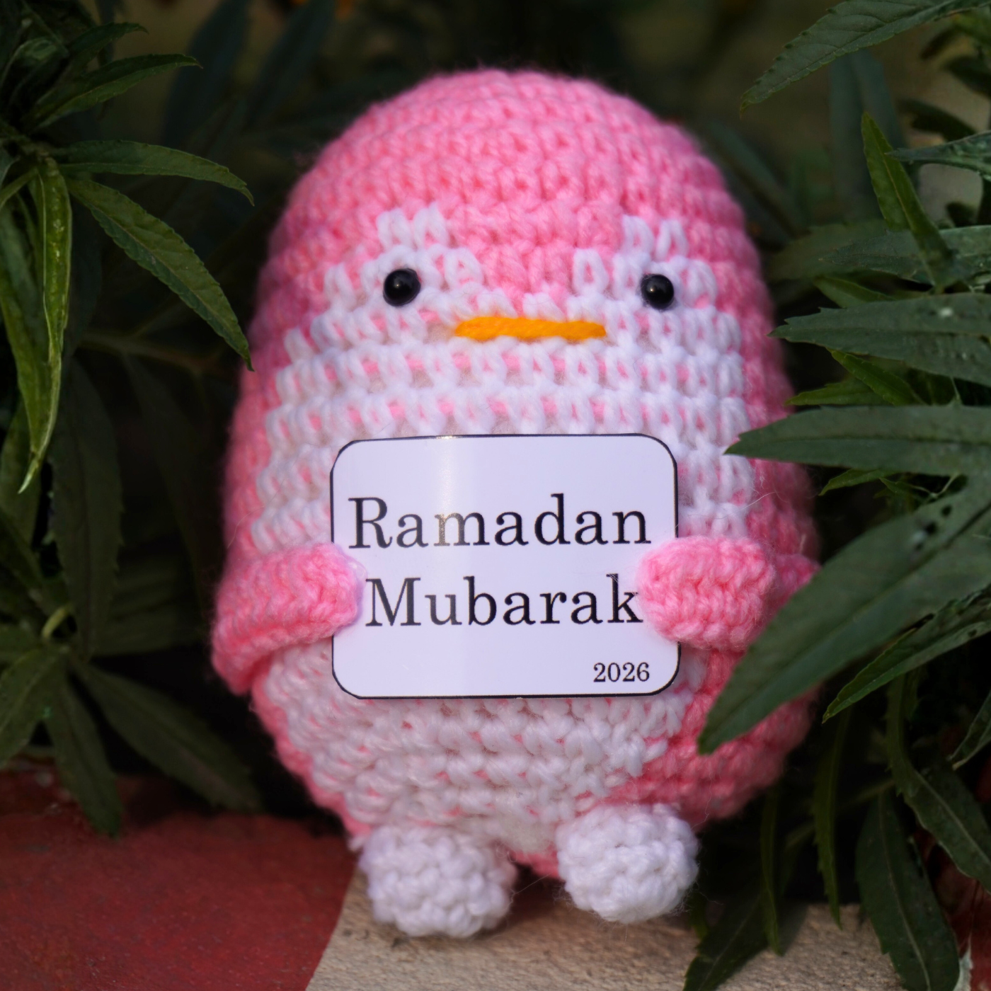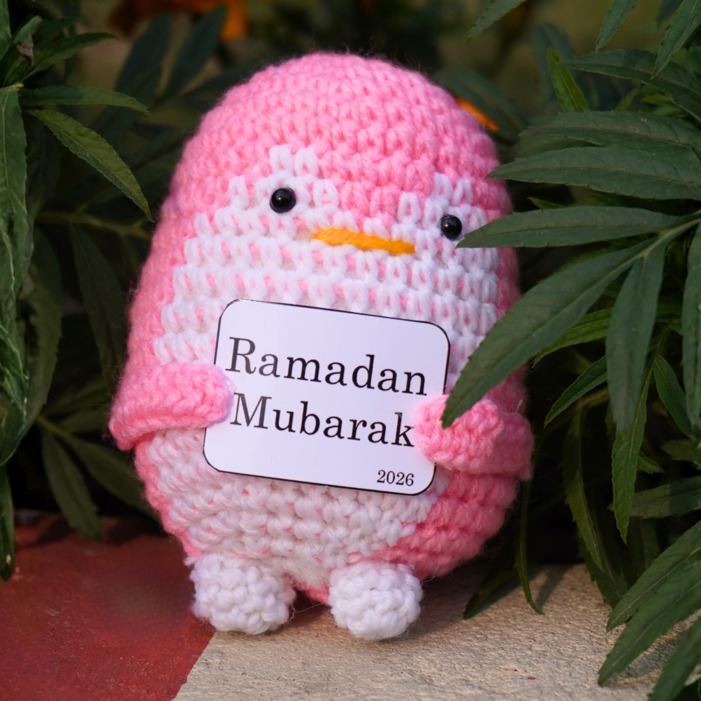 The joy of community and celebration, this penguin adds a playful pop of color to your festivities. Its vibrant pink and snowy white crochet body is accented by a bright yellow beak and a "Ramadan Mubarak" sign. This piece is designed for those who love modern, "kawaii" aesthetics and want to bring a smile to guests of all ages during the holiday season.