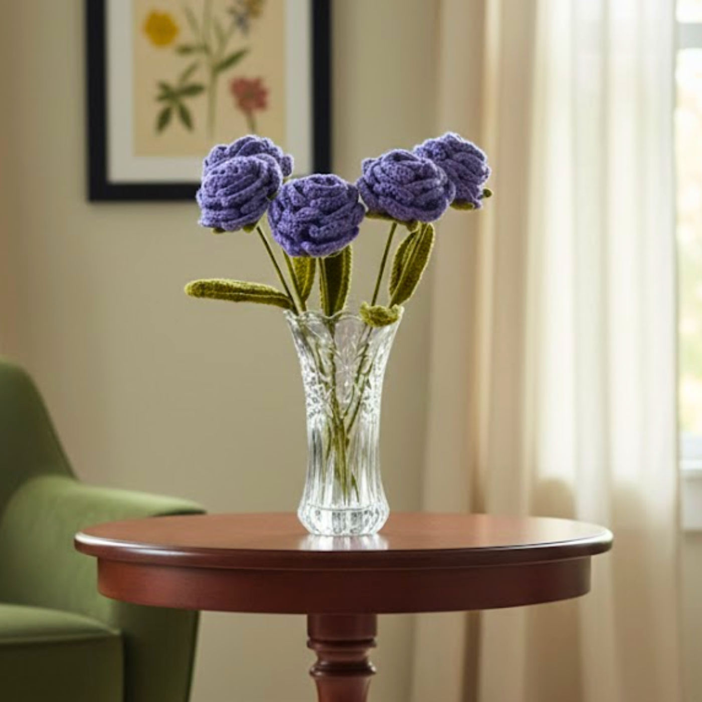 Inspired by handcrafted elegance, this crochet rose bouquet brings a regal blend of deep purple hues and intricate spiraled texture to your decor. Each rose is carefully crafted with multiple layers of "petals" to create a full, blooming bud, offering a timeless symbol of romance and mystery. This arrangement provides a luxurious, soft aesthetic that complements bookshelves, nightstands, or vanity tables without the need for water.